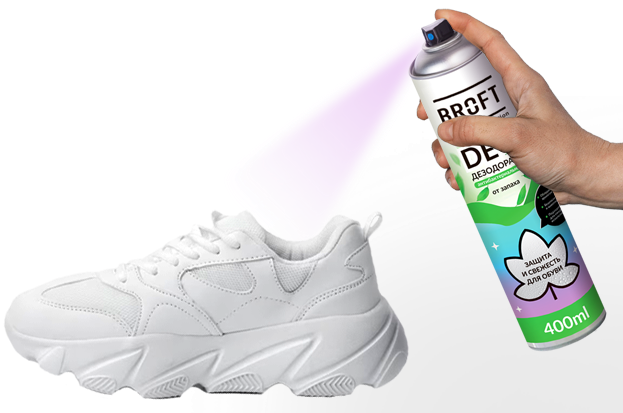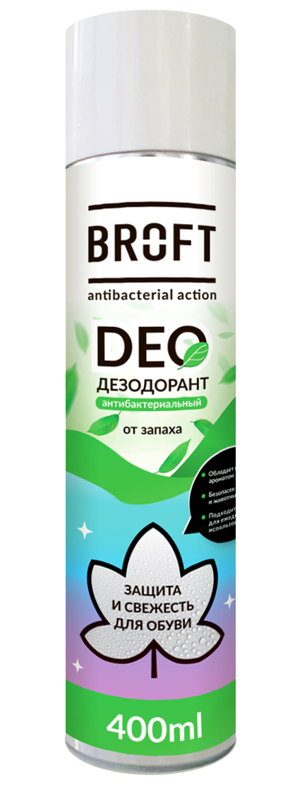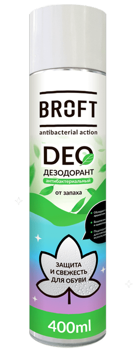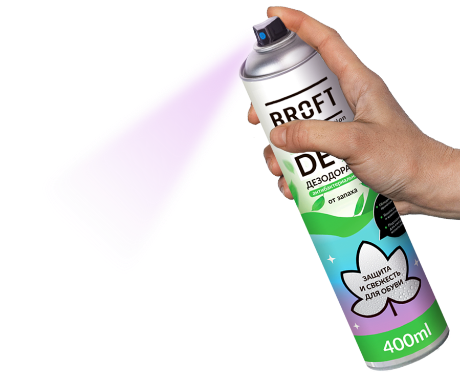 Безопасность: Качественный дезодорант BROFT для обуви безопасен для человеческого здоровья и окружающей среды. Он содержат антибактериальные компоненты, но при этом не представляют угрозы для кожи стопы.