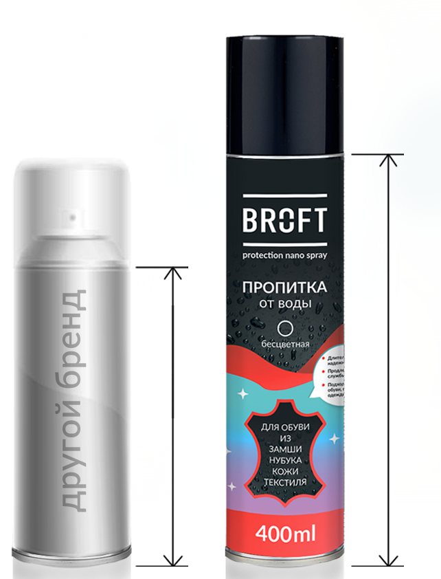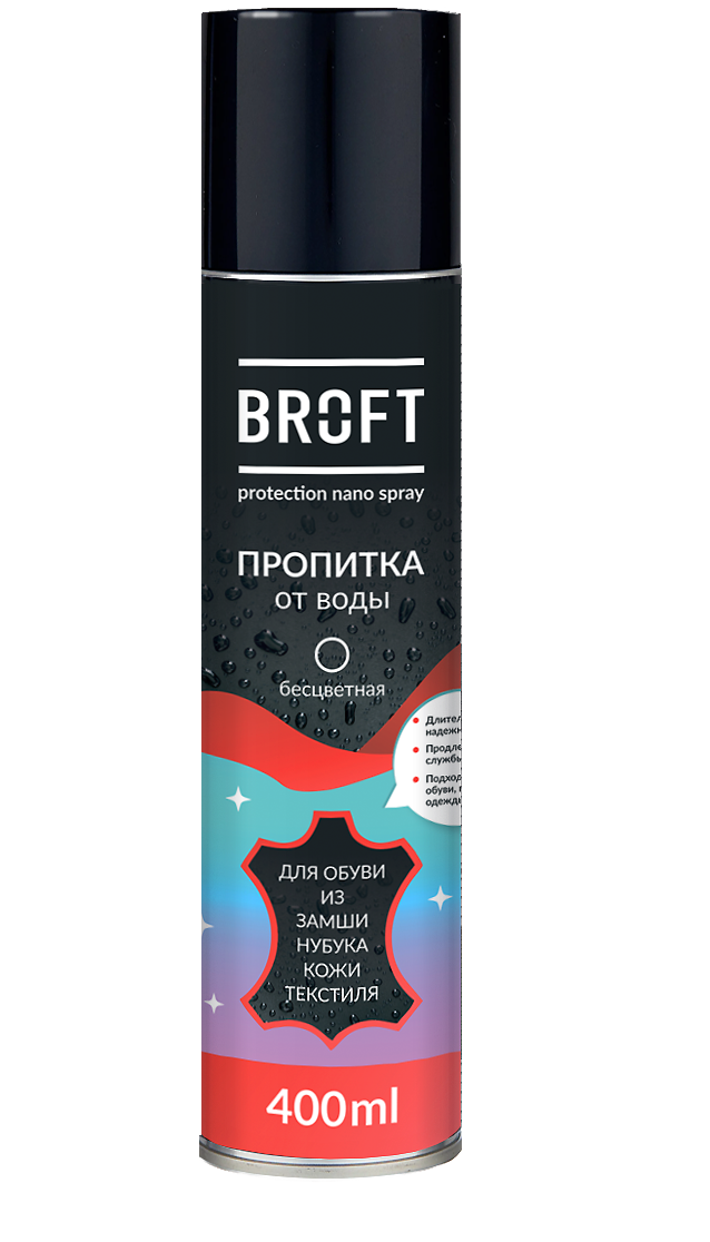 Регулярно проводите обработку нашим средством по уходу за обувью, чтобы сохранить превосходный внешний вид Вашей обуви и одежды на долгое время и продлить им жизнь. Водоотталкивающий спрей, пропитка BROFT – инновационные нано технологии, созданные для бережной и эффективной защиты Вашей обуви и одежды.